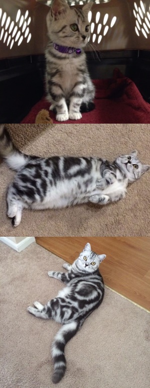 Hello! We thought that Belle and England might enjoy an update on their little girl, born 10/24/2013. The former Miss Molly now reigns as Holiday “Holly” Golightly and she is an absolute joy. She is by far the most loveable cat that any of us have ever met. She defies her British Shorthair pedigree in that she is quite energetic, running, jumping, climbing all over the place and seeing just about everything she comes across as a toy. But she is also a quiet, sociable, and affectionate lap cat. She has never gone into hiding, not even the first day that we brought her home and she has been friendly to everyone who has come over, even allowing our two-year old nephew to chase her around the house during the family Xmas party. And more than one person has told us that she is the prettiest cat they have ever seen. We certainly can’t disagree with that! Thank you so much for what you do. We cannot imagine a more perfect pet for our family!